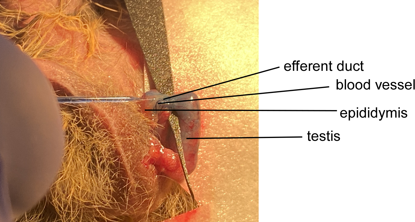 摘要:树鼩的睾丸结构与灵长类动物类似,精子在睾丸中生成以后,经过输出管到附睾中形成成熟精子。本实验方案的主要内容是将转基因的精原干细胞通过输出小管移植到受体雄性树鼩的睾丸中,移植后的精原干细胞可以在受体树鼩睾丸中存活并持续生成精子,后期通过与雌性树鼩交配产生转基因树鼩。