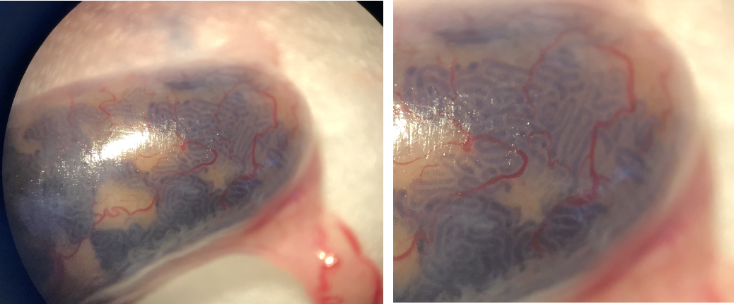 在注射细胞时,可以看到混有台盼蓝的溶液沿着曲细精管快速充盈睾丸(图2)。如果注射失败,蓝色液体不会如图2中这样呈管状分布,而是会将整个睾丸变蓝。
