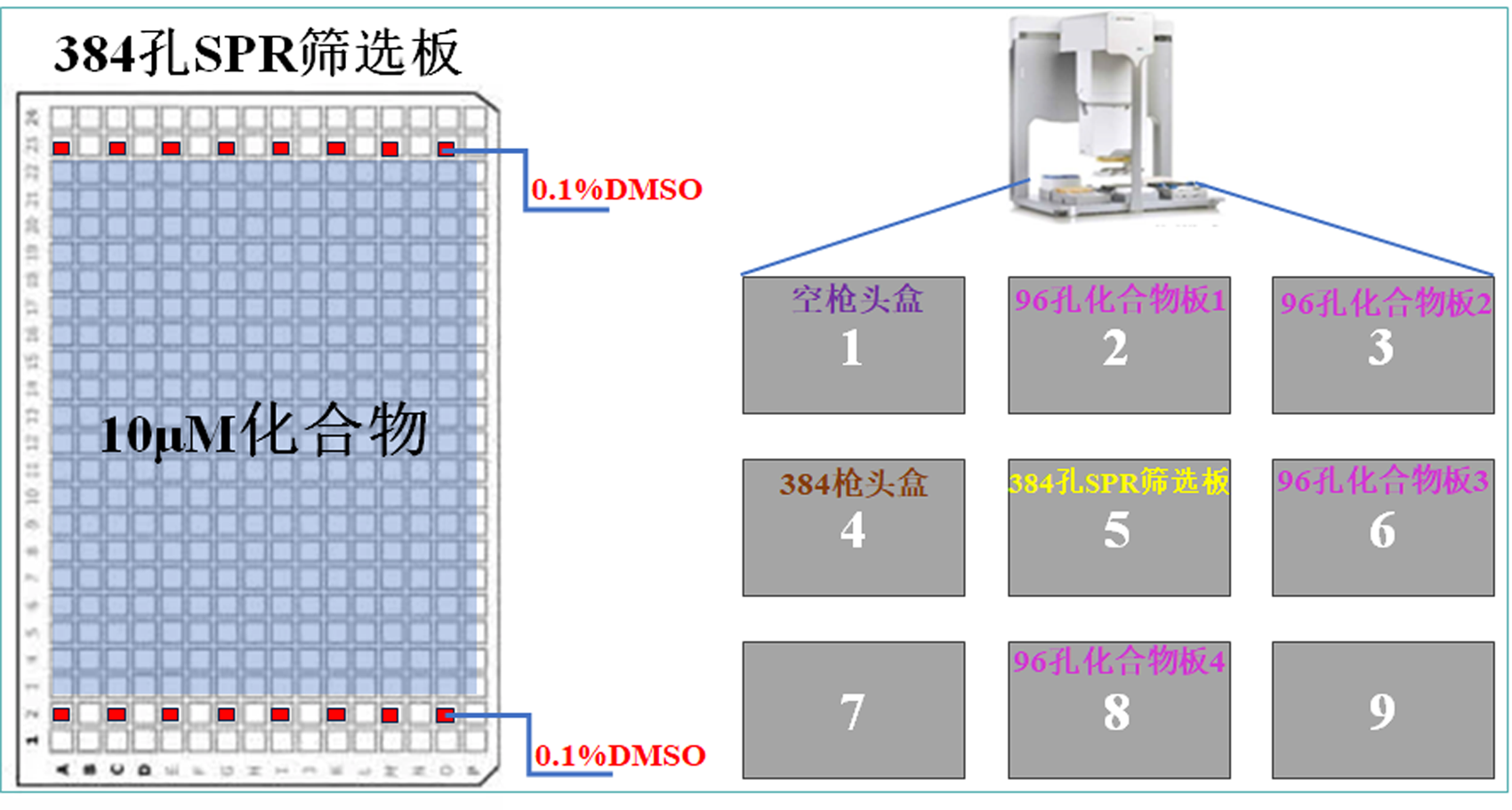 图3 384孔SPR筛选板排布以及Bravo仪器板位排布