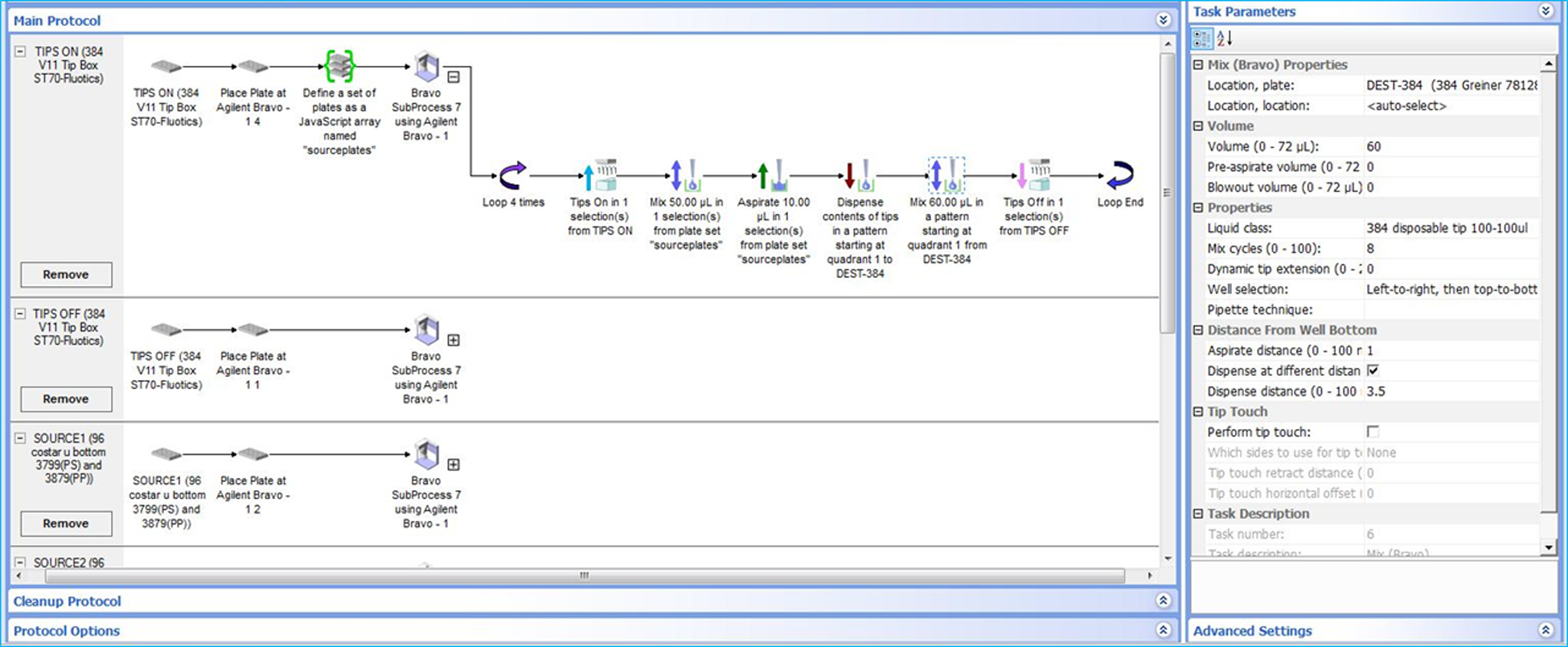 (1) 用来进行化合物稀释的Agilent公司自动移液工作站Bravo仪器程序的准备。至少提前一天编辑所需的程序并进行预运行,确保筛选时程序的可行性。