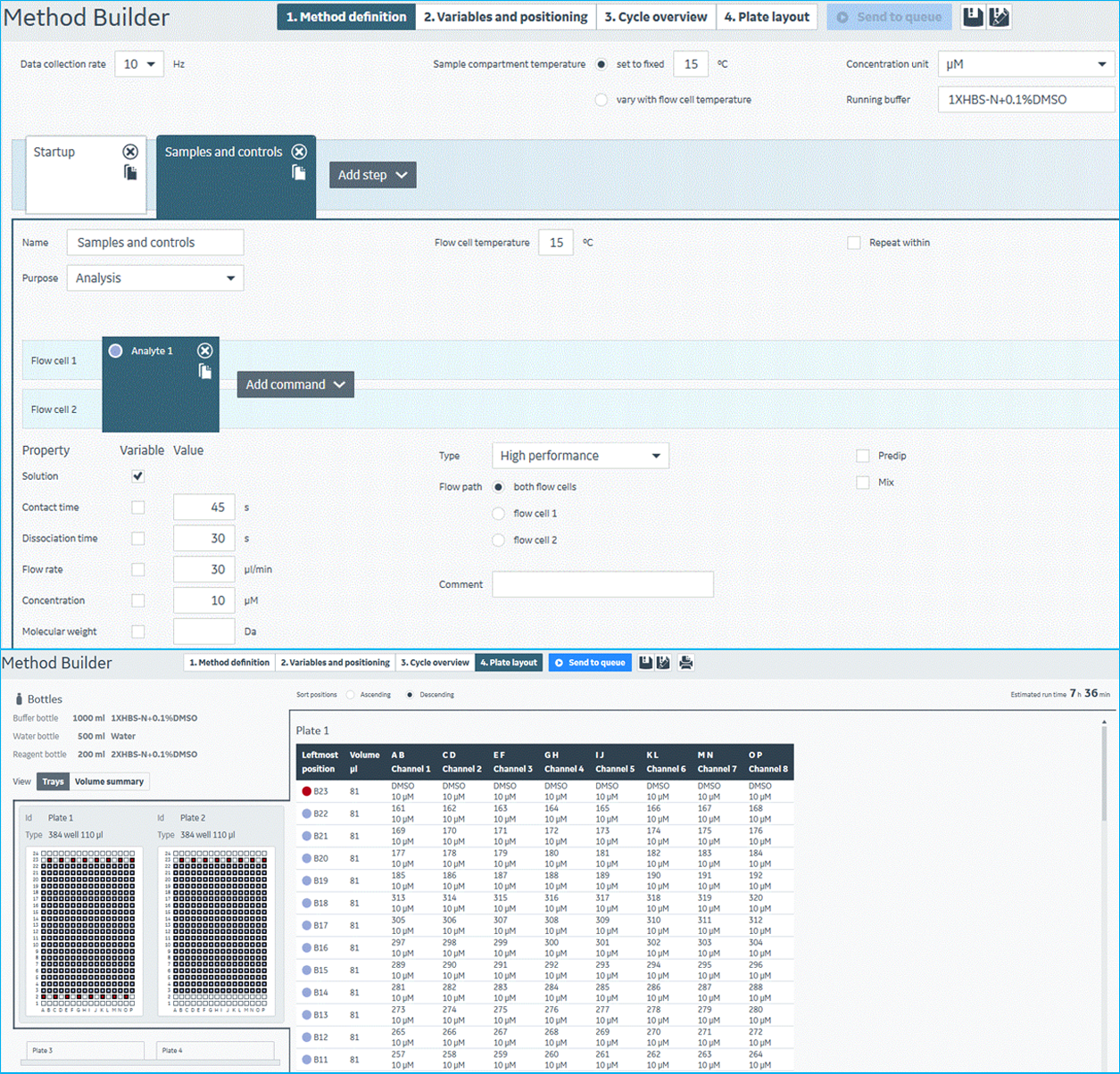 - Clean Screen。按序取4块已封膜且作标记的384孔化合物筛选样品板分别固定在Biacore 8K仪器对应样品板架上,放置在Biacore 8K仪器内上下两层样品舱中。Biacore 8K仪器将按照图六所示实验方法自动进样开展Clean Screen。待该轮筛选结束,可及时放置下一轮筛选样品进行Clean Screen,直至所有化合物都完成筛选。