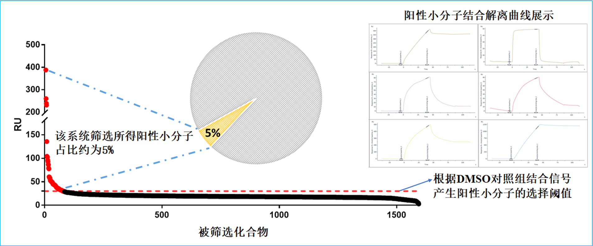 - 筛选数据的分析。在该筛选体系中,每个样品在解离前5秒结合曲线所对应的共振单位RU值为其筛选信号。在选择阳性化合物时,根据所有DMSO阴性对照样品的筛选信号的平均值以及标准方差来产生选择阈值。筛选信号高于选择阈值且不超过对应Rmax值5倍,其结合解离传感曲线行为正常的化合物即为筛选所得阳性化合物。该类筛选阳性率在5%左右,通过对阳性化合物已有的作用机制归类发现此类筛选通常会筛选出一系列作用机制相同的化合物。这一现象充分验证了该类筛选系统的可靠程度。
