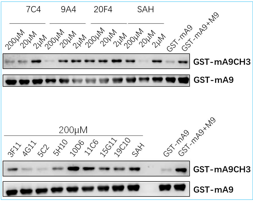 图14 筛选所得阳性小分子可特异抑制底物蛋白的甲基化水平