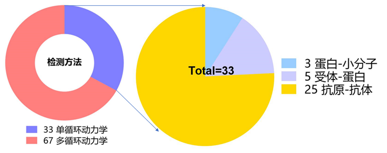 在利用SPR技术进行生物分子间结合亲和力检测的时候,分析物进样可以采取单循环(single-cycle)模式或者多循环(Multi-cycle)模式。单循环动力学检测方法适用于快速筛选和初步动力学参数的估计,而多循环动力学检测方法则可更精准地检测分子间互作的动力学参数。当分析物样品量有限,或者分析物与配体结合后的解离速度非常慢时,可以考虑采用单循环动力学方法来实验。如图7所示,在收集的研究论文中,有33例SPR实验采用了单循环动力学方法来检测分析参数,67例SPR实验采用了多循环动力学检测方法来获得动力学参数。在33例采用单循环动力学模式的研究对象中,四分之三为针对抗原抗体亲和力表征,5例为受体与蛋白亲和力表征,3例为蛋白与小分子互作检测。这一统计结果提示在进行抗原与抗体亲和力表征SPR实验中,可通过单循环动力学检测方法来开展快速筛选以及初步动力学参数检测。