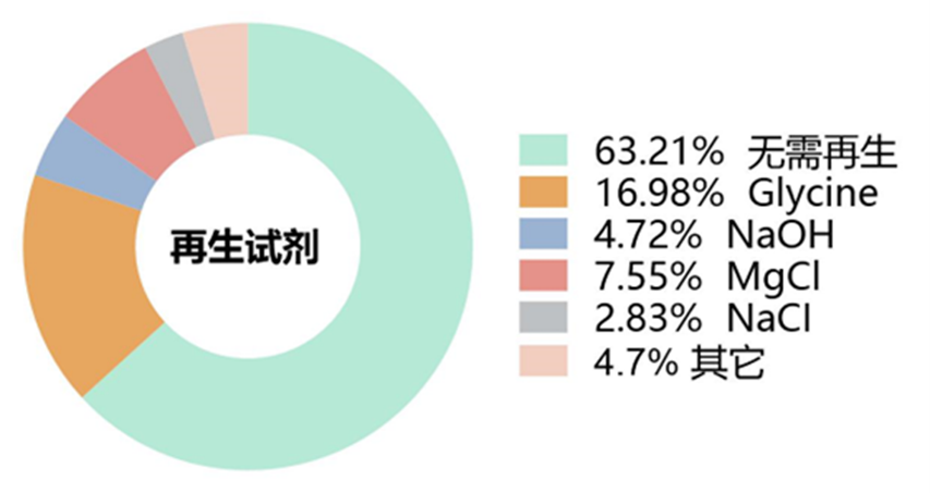 在多循环动力学检测过程中,通常会涉及到再生试剂的使用。再生试剂的使用是为了在每次分析循环后从传感芯片表面去除结合的残留分析物,以便为下一个分析循环做准备,同时也可充分保证下一个分析循环的基线平稳。但常用的再生试剂通常是强酸、强碱以及高浓度盐溶液等,这些再生试剂因条件剧烈,其在芯片再生过程中容易造成固定在芯片表面的配体蛋白失活,最终导致实验失败。因此,替代再生步骤的温和处理方案是不使用再生试剂,仅通过长时间的运行缓冲液的冲洗来尽可能去除上一个分析循环中残留的分析物。从本文统计图8来看,约64%的SPR实验没有使用再生试剂,这其中除33例因采用单循环动力学实验而无需再生过程以外,有近一半的多循环动力学检测实验并没有使用再生试剂。再生试剂中使用频率最高的是不同pH值甘氨酸-盐酸溶液例如:10 mM Glycine-HCl (pH1, pH1.5, pH2.0, pH2.5, pH3.0);其次是不同浓度的氯化镁例如:2 M MgCl2, 3 M MgCl2, 4 M MgCl2;以及不同浓度的强碱NaOH例如:5 mM NaOH, 25 mM NaOH, 50 mM NaOH;此外,还有SPR实验中使用500 mM NaCl, 1 M NaCl, 0.35 M EDTA and 0.1 M NaOH, 10 mM sodium acetate (pH 5.0) containing 1 M NaCl, Phosphoric acid 1.7%, 50% isopropanol以及1 M NaCl and 50 mM NaOH来进行再生。