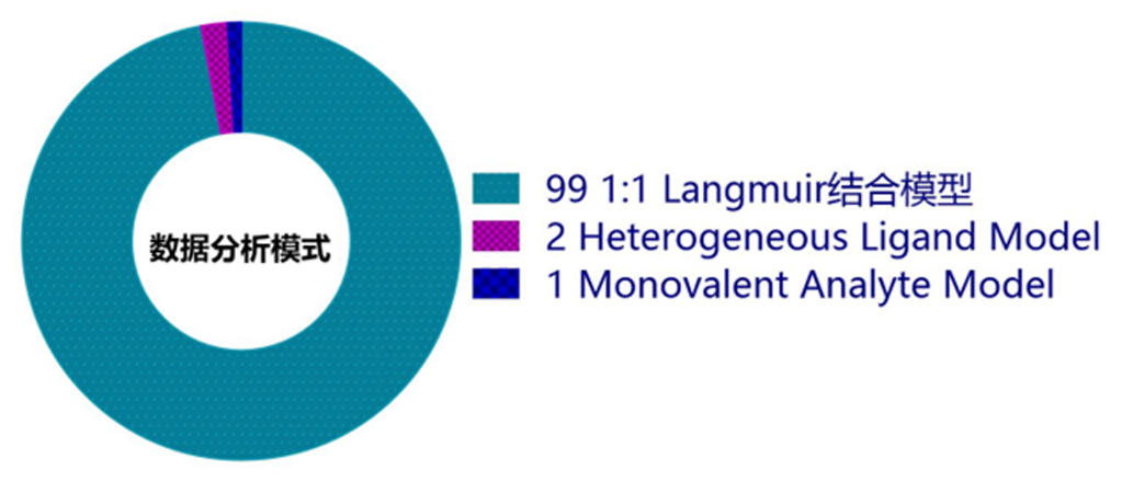 在统计的研究论文中,几乎所有SPR实验数据分析模式都遵循了1:1 Langmuir结合模型来进行亲和力参数拟合(图9)。只有2例研究采用了Heterogeneous Ligand模型这样的多位点结合模型,1例采用了Monovalent Analyte模型。