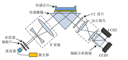 金属表面存在大量自由运动的电子,特定条件下,入射电磁波与金属表面的自由电子发生耦合而产生共振,自由电子发生周期性振荡,这种现象被称为表面等离子体共振(简称SPR)。发生SPR的必要条件是入射电磁波与表面等离体波(简称SPW)的波矢匹配,为实现入射光与SPW波矢匹配,采用棱镜、金膜、待测介质的三层Kretschmann棱镜耦合结构。当棱镜与金膜的参数固定时,SPR现象仅与待测介质的折射率相关,因此检测SPR反射光强或在面阵光电探测器件上的相位干涉成像,即可获得具有空间分辨率的待测介质折射率空间分布 [1–4]。