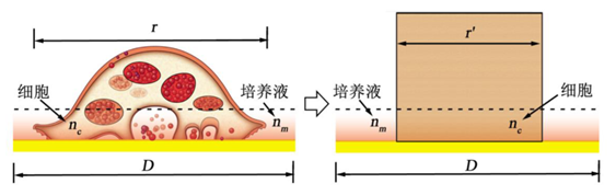 因此可以将不规则贴壁形状的细胞视为长方体,长方体的底面积为细胞与金膜贴壁的等效底面积r’,简化后的折射率等效模型如图5所示[11–13]。
