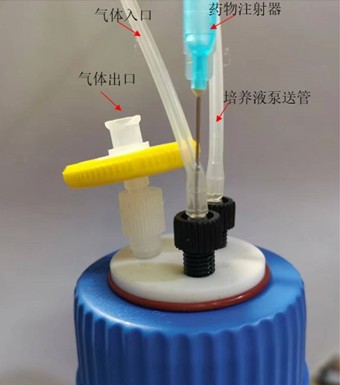 - 在细胞进入对数生长期之前,进行加药操作,具体为:关闭培养液更新蠕动泵,向原培养液加入配制好的药物,并左右轻轻摇匀,重新开启蠕动泵,持续通入含药物的培养液40小时(以1 μg/mL紫杉醇为例,用注射器抽取0.1 mL配制好的紫杉醇原溶液,将无菌注射器针头扎入培养液二氧化碳入口的硅胶管,将药物注入培养液瓶并摇匀,药物注射方式如图11所示);