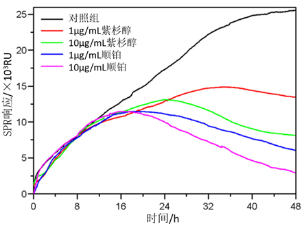 - 至此,完成了一种浓度的药物刺激检测。终止SPRcellyzer的数据采集,终止培养液更新等细胞培养设置,取出细胞检测模块等细胞及培养液相关的仪器组件,完成此次实验。通过重复步骤二至步骤四,依次进行试剂溶液准备、芯片处理、灭菌、细胞悬液制备、细胞模块组装、仪器系统调节、细胞培养与检测、药物添加与检测等实验操作,完成1 μg/mL和10 μg/mL的紫杉醇与1 μg/mL和10 μg/mL的顺铂等预先设计的不同药物种类、不同浓度的药物刺激检测,并完成仅使用培养液不给药的对照实验,获得不同实验条件下细胞生长状态的SPR曲线测量。