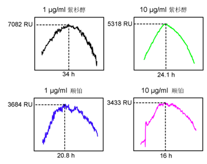 - 当HeLa细胞受到任何药物刺激时,SPR曲线上升一段时间后,到达峰值便开始下降,表明细胞在药物持续刺激下生长受到抑制。