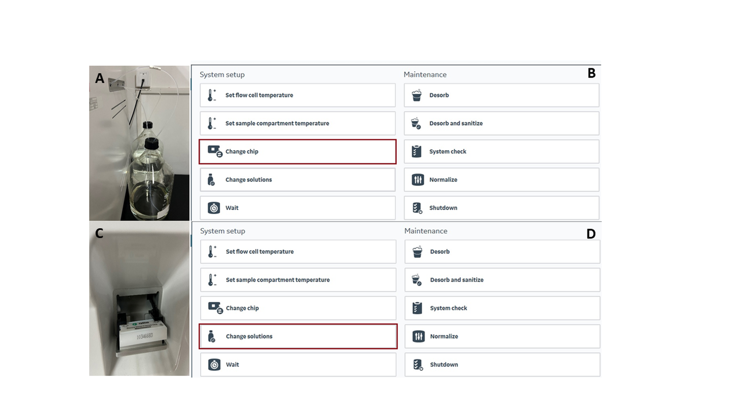 图1 实验准备。 A. 进液管位置;B. change chip界面;C. 更换CM 7芯片;D. change solution。