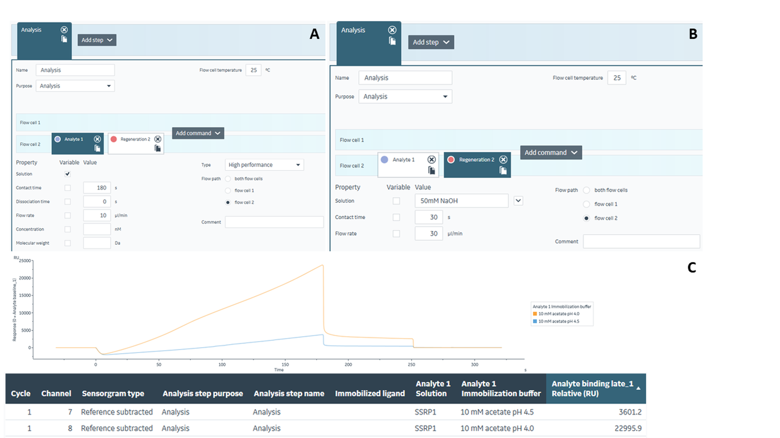具体测试方法如下:在控制软件methods一栏选择pH scouting新建预偶联实验方法,选择通道7和8作为此次实验通道,flow cell1 作为reference cell不勾选,只勾选flow cell2流过溶液(如图2A)。设置analyte-regeneration的实验程序,以10 μL/min的流速观察SSRP1分别在pH 4.0和pH 4.5的条件下,180 s内流过芯片表面的响应值。SSRP1进样结束后,用50 mM的NaOH溶液作为再生试剂,30 μL/min流速进样30 s,对芯片表面再生处理(图2B)。测试结果如下:SSRP1在pH4.0和pH4.5的条件下,预偶联量分别达到了22995.9 Ru和3601.2Ru(图2C)。SSRP1蛋白等电点较低, pH4.0的醋酸钠条件才能使芯片表面富集正电荷。因此,选择pH4.0,浓度100 μg/mL,作为此次SSRP1配体偶联条件,希望蛋白偶联量尽可能高。