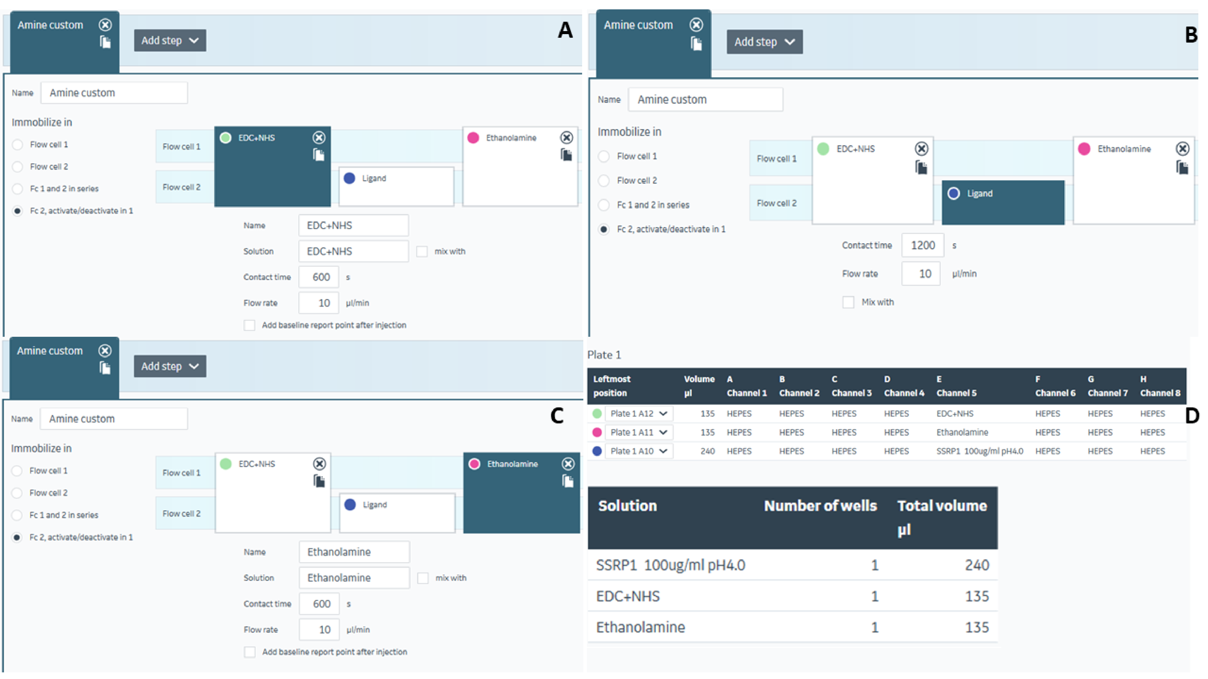 图3 SSRP1偶联。 A. 芯片表面活化;B. 配体偶联;C. 芯片表面封闭;D. 所需样品量。
