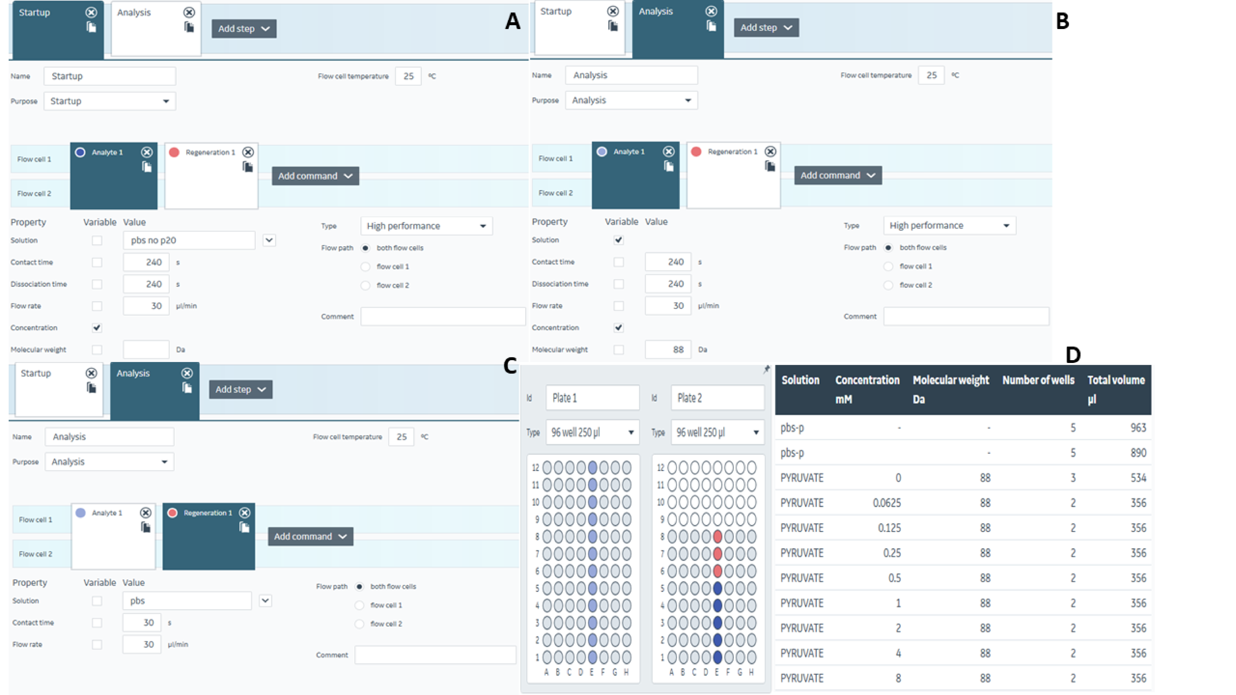 图6 丙酮酸钠亲和力测定。 A. Start up参数设置;B. analysis 参数设置;C. regeneration 参数设置;D. 各样品放置位置及体积。