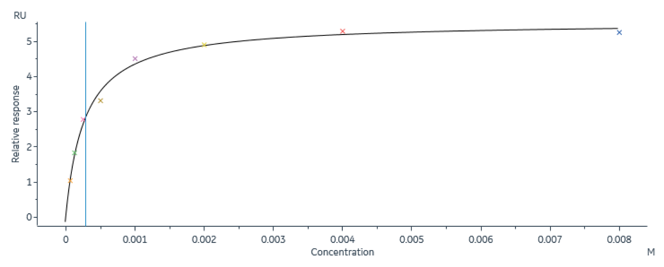 五、数据分析仪器配套分析软件 BiacoreTM Insight Evaluation Software中,依次选择Predefined-Kinetics/affinity-LMW,选择 LMW multi-cycle affinity-Evaluation method对所测数据进行分析,以丙酮酸钠浓度为横坐标,每个浓度对应的响应值为纵坐标,通过稳态分析方法拟合,得到拟合曲线(图7),亲和力常数KD为280 μM。
