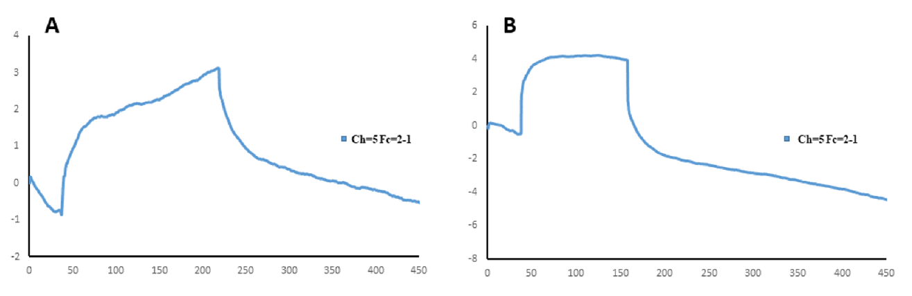 - 控制软件methods菜单中,选择LMW的文件夹,并从中选择LMW kinetics/affinity,在method definition中新建测试方法:1)新建analysis步骤:analyte1-regeneration1,并按照method中参数具体要求,依次进行以下设置:结合时间(contact time)180 s, 解离时间(dissociation time)300 s,溶液流速(flow rate)设置为30 μL/min;选择high performance模式,Flow path为both flow cells(flow cell 1作为参比通道流过分析物),cycle数设为1。2)96孔板样品位置的设置:选择channel 5 plate 1,analysis 1和buffer分别加入到F9和F10 对应位置,分别用于analyte,和regeneration,其余位置用缓冲液补齐。3)所有溶液加好后,96孔板卡入样品架放入样品仓,关闭仓门,设置本次实验名和保存路径,开始测试。结果如图5A所示,:响应值较低且结合曲线不平滑,有非特异性信号存在。将PBS 缓冲液改为PBS-P 后,丙酮酸钠浓度提高到2 mmol/L再次检测,如图5B所示,以上问题均得到改善。后续的亲和力测定在PBS-P 缓冲液中完成。
