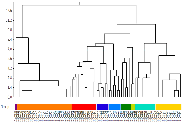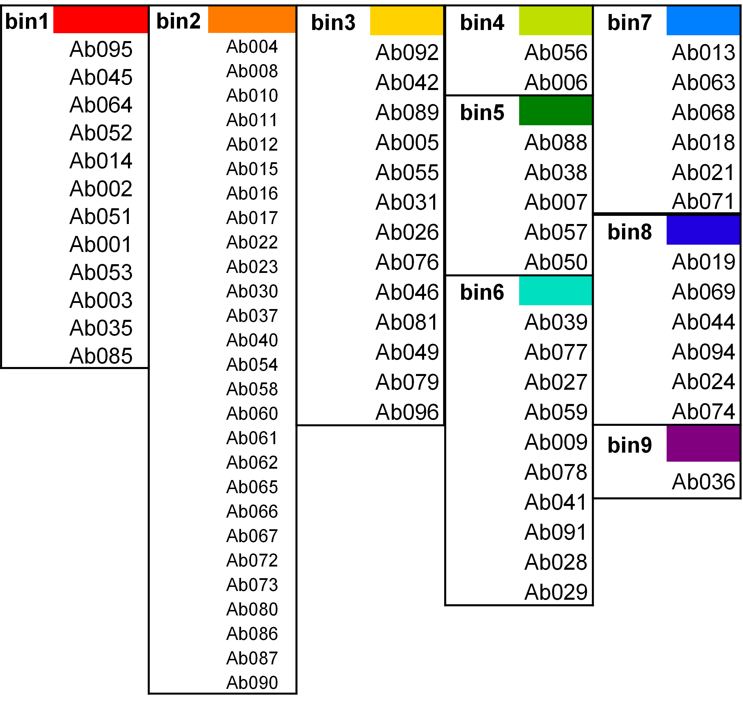 图1 抗体表位相关性树状图。 1. 关键分支注释:- 橙色框(Bin2):显著聚集分支(p<0.01),对应Bin2抗体群(占比>30%)。- 蓝色及红色框:高相关性抗体组(Bin1与Bin8),竞争抑制率>80%。2. 统计学方法:聚类算法:平均连锁法(Average Linkage)。