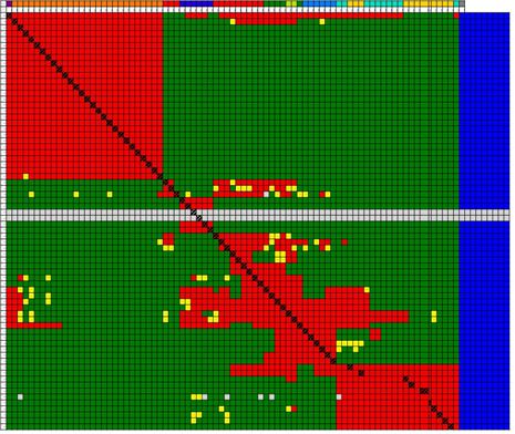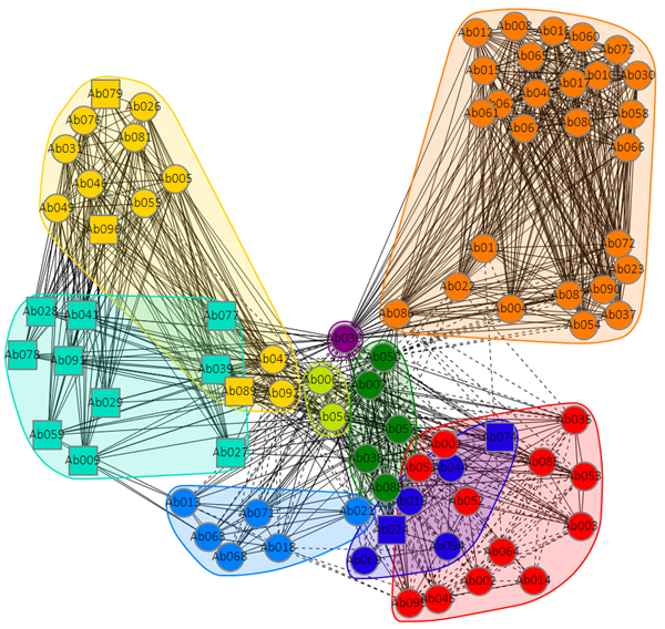 抗体表位相关性树状图如图1所示,根据分析软件或已知表位相关性判断归类阈值。抗体表位相关性矩阵如图2所示,由对称性以及自阻断判断结果可信程度,本实验中矩阵显示相同抗体自阻断正常。抗体表位归类网络如图3所示,对数据进行汇总,结果如图4所示,可归为9组表位。