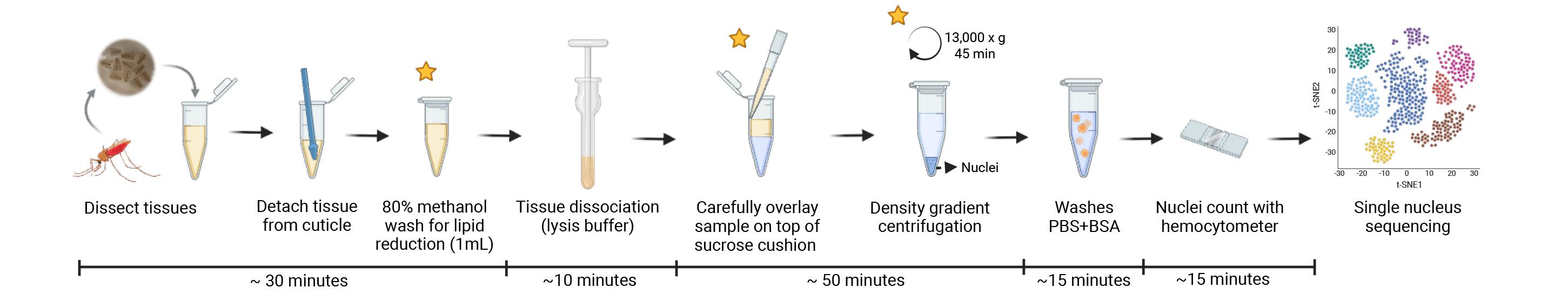 Tissue dissociation and nucleus isolation from mosquito fat body and associated tissues for single-nucleus RNA sequencing applications. Stars represent the critical steps of the protocol.