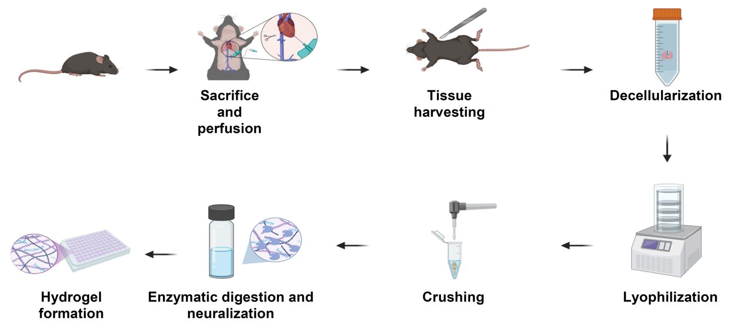 • A standardized digestion–gelation process optimized for heterogeneous and lipid-rich murine tissues, enabling reproducible hydrogel formation at defined ECM concentrations.