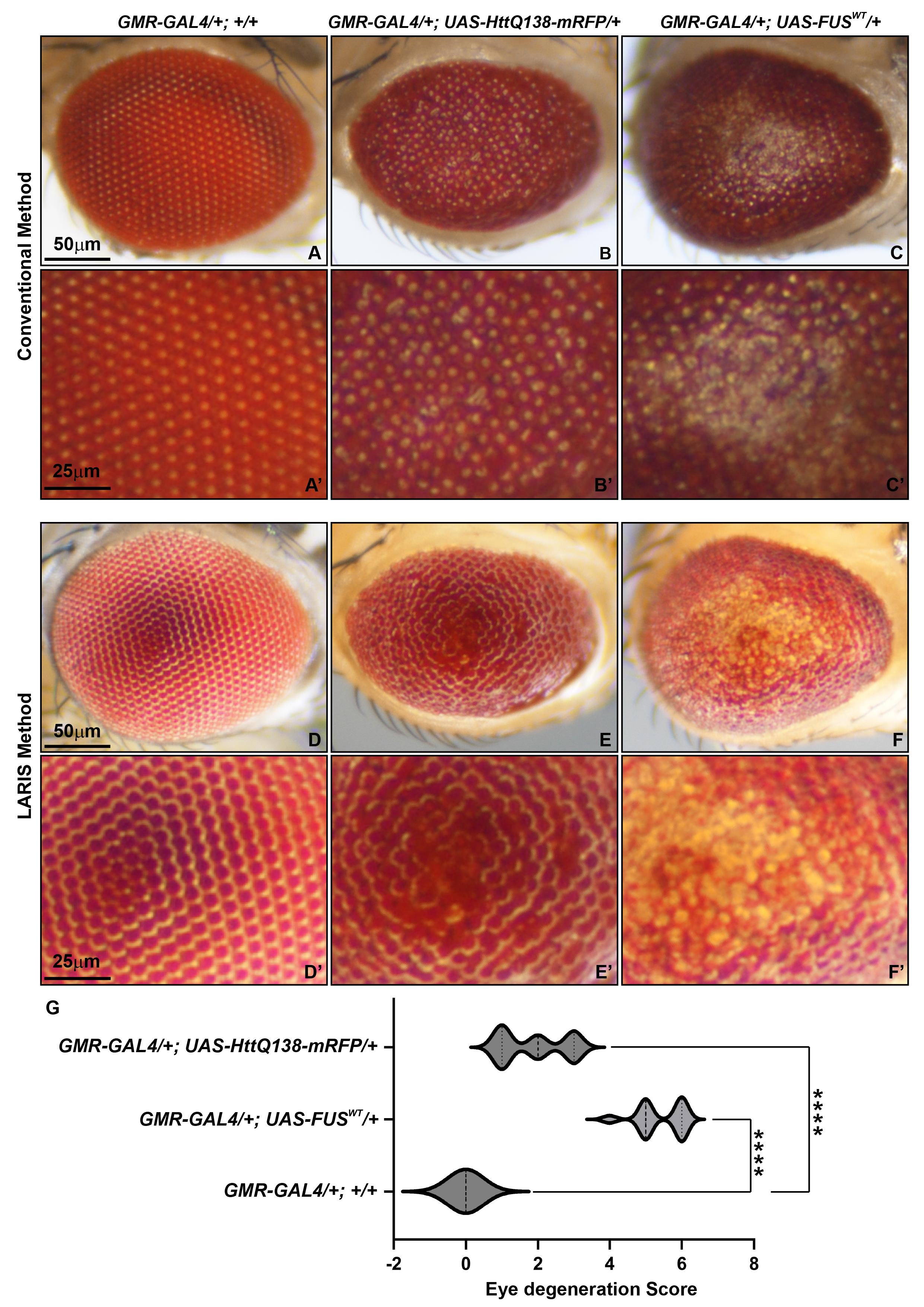 1. Adult flies (3 days old) of desired genotypes; we used GMR-GAL4/+; +/+, GMR-GAL4/+; UAS-HttQ138-mRFP/+, and GMR-GAL4/+; UAS-FUSWT/+ lines for adult eye imaging in this study.