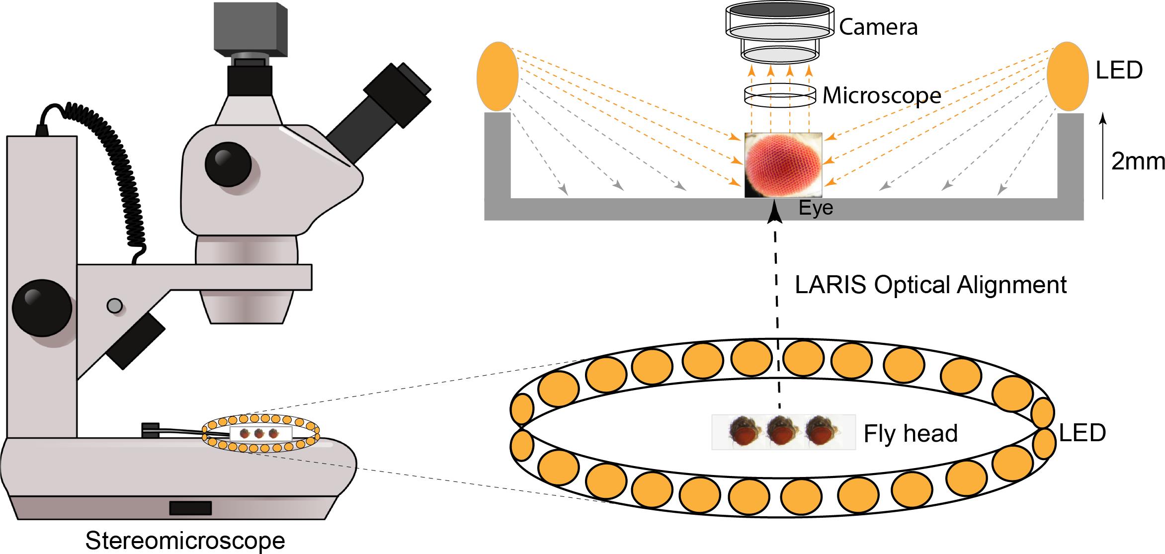 • Low-angle ring illumination stereomicroscopy (LARIS) is an improved optical alignment for high-contrast imaging of Drosophila compound eyes.