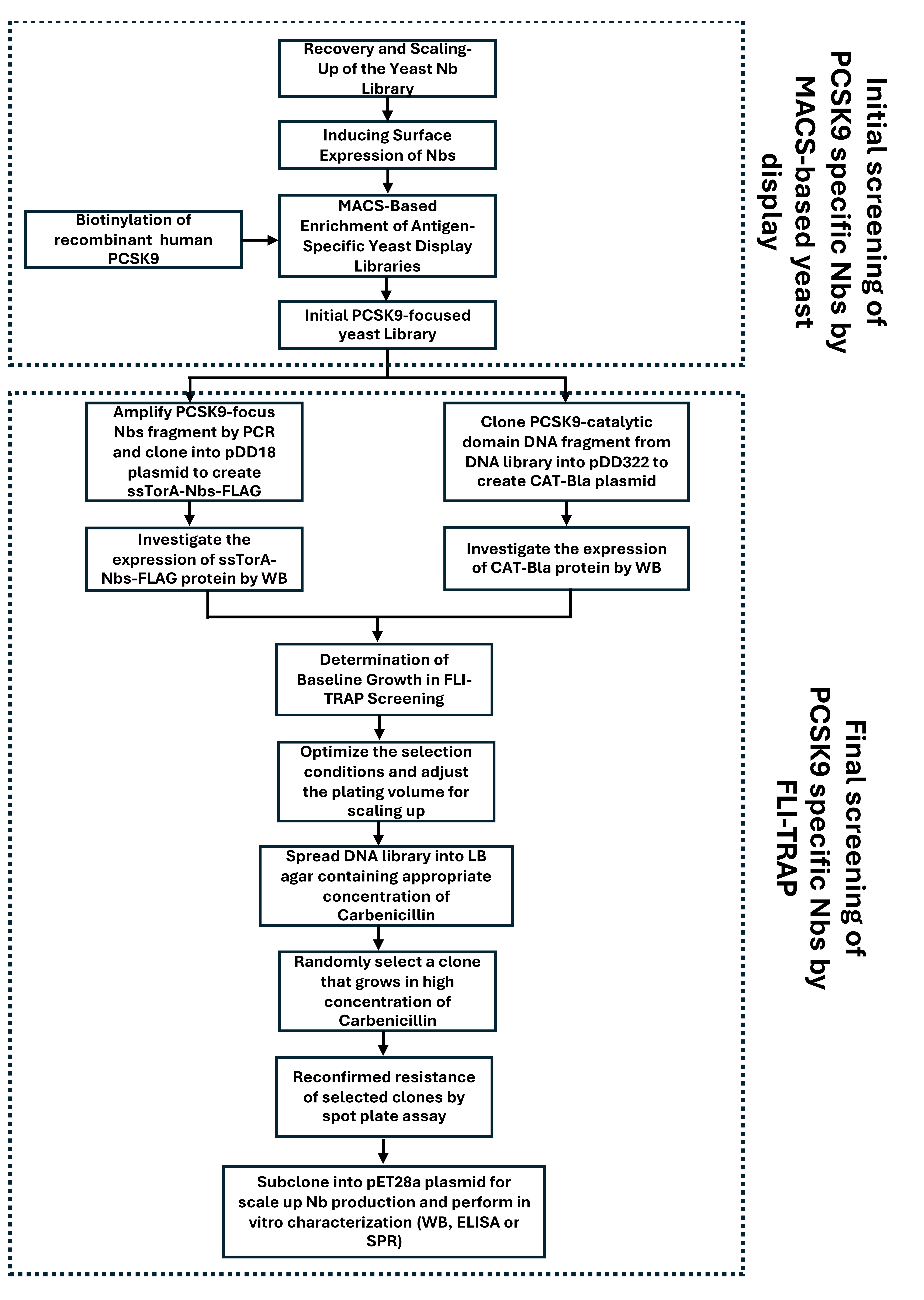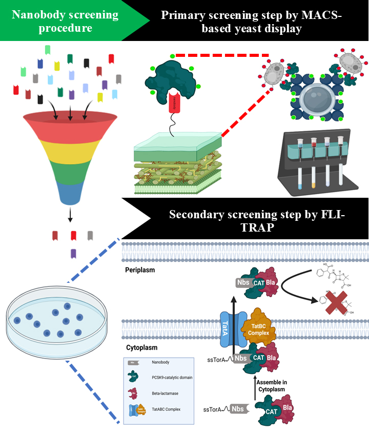 Together, the combination of MACS-based yeast display for broad antigen-binding enrichment and FLI-TRAP for functional bacterial selection offers a powerful, rapid, and economical platform for Nb discovery. This two-step strategy reduces the need for iterative screening and enables efficient identification of binders with strong biological relevance, making it an attractive alternative to traditional methods.