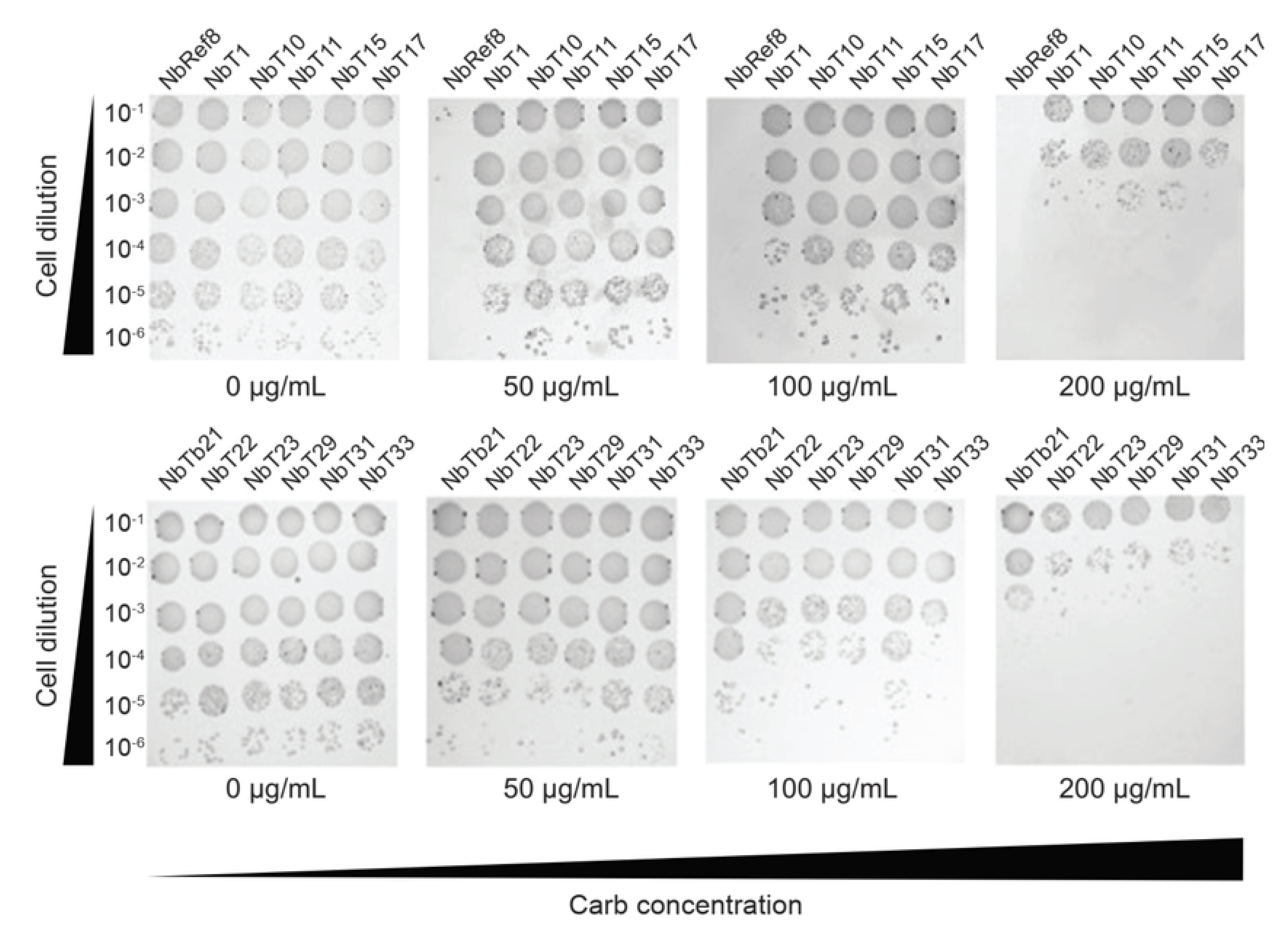 Figure 3. Selection of PCSK9 CAT domain-specific nanobodies (Nbs) performed by co-transforming E. coli NEB10β cells with pDD18-ssTorA-Nbs-FLAG and pDD322-CAT-Bla on LB agar containing 0–300 µg/mL carbenicillin (Carb). Thirty random resistant colonies were isolated, and sequencing identified 11 unique full-length nanobody sequences. Spot plating analysis showed that all 11 clones conferred strong resistance at 50–100 µg/mL carbenicillin, with reduced but detectable resistance at 200 µg/mL. In contrast, the clone containing pDD15-Ref8-FLAG nanobody did not support cell growth at 50 µg/mL [7].