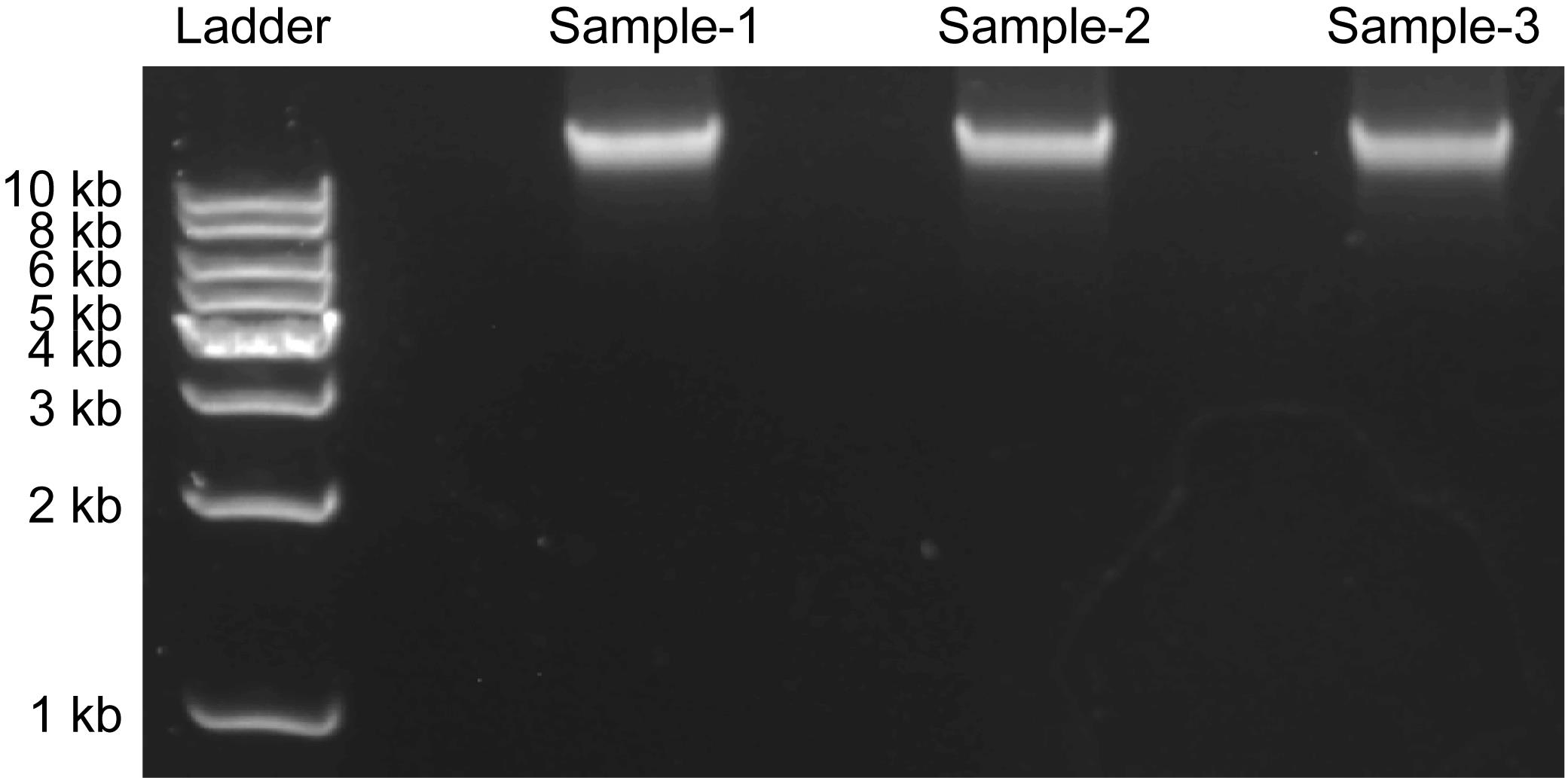 7. Load samples and run the gel at 150 V for 30 min in 1× TAE buffer. The genomic DNA of C. reinhardtii is greater than 10 kb (Figure 1).