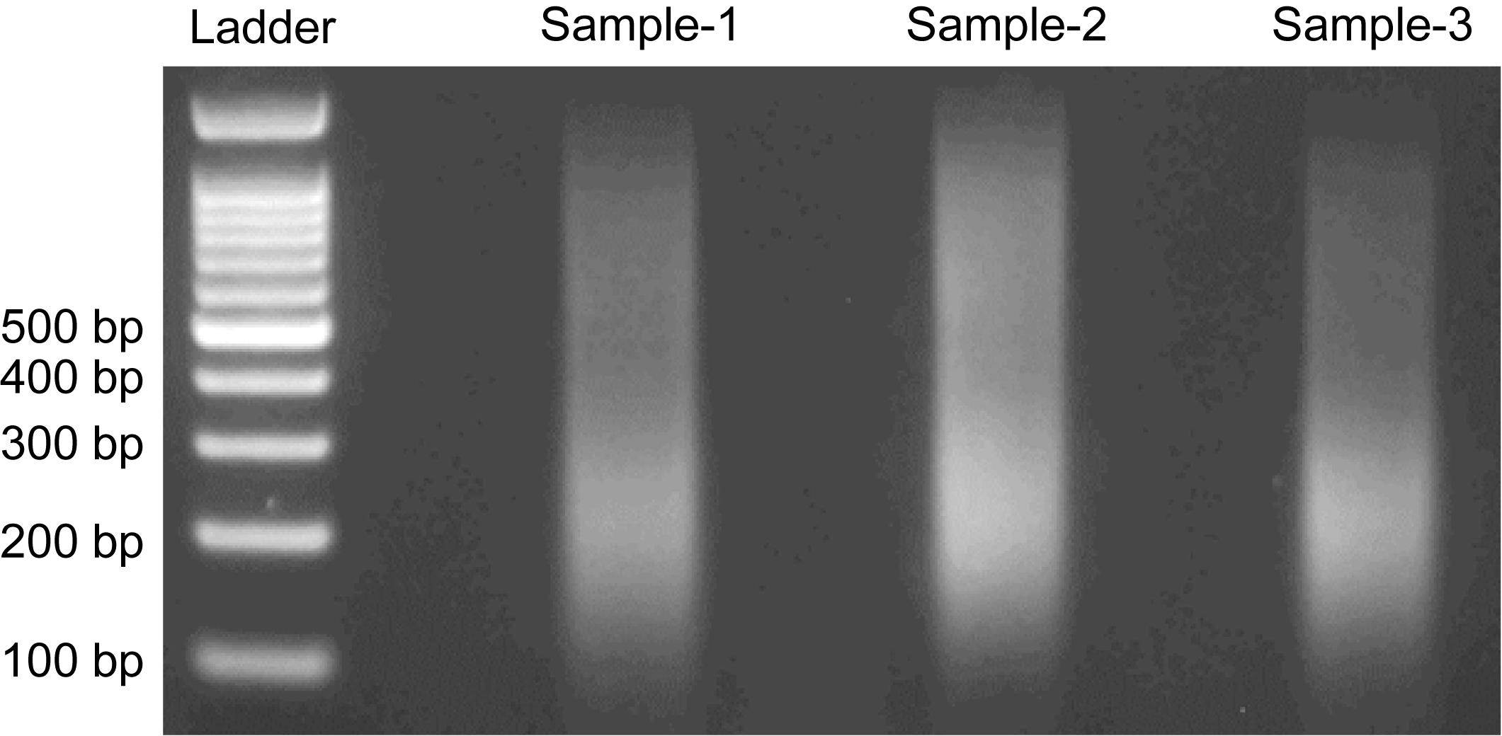 2. Take 500 ng of the DNA library and run a 2% agarose gel electrophoresis (150 V, 30 min, 1× TAE). As shown in Figure 5, a dense smear centered around 400–500 bp should be observed.
