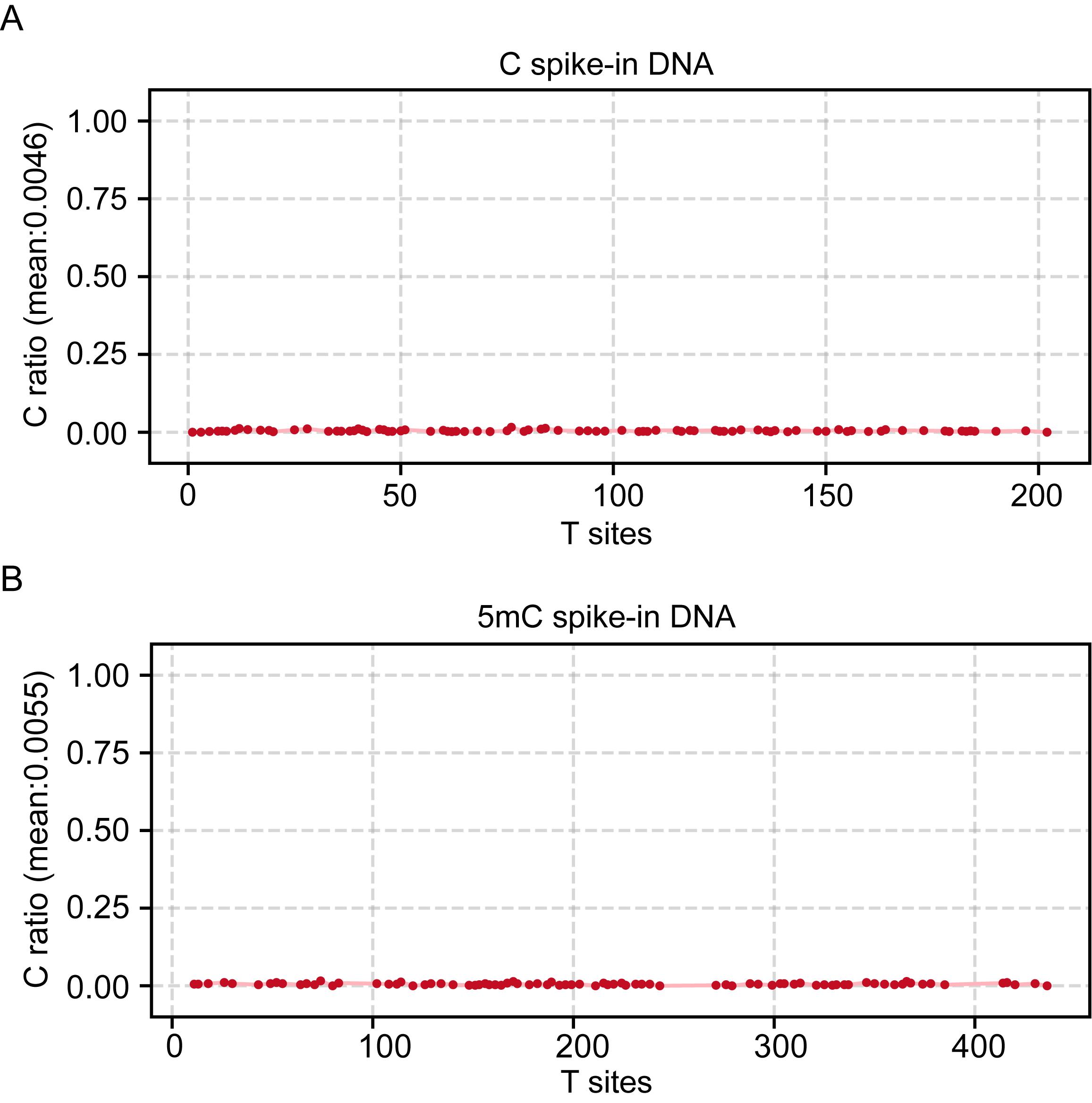 Figure 4. Nanopore sequencing of the PCR product of C (A) and 5mC (B) spike-in DNA. In detail, each point represents a single cytosine site, which can be deaminated to thymine during PCR amplification and sequencing. The vertical axis shows the observed C ratio, representing the frequency of unconverted cytosines at each site. In C spike-in DNA, the average remaining C ratio is 0.46%, indicating a deamination efficiency of 99.54%. In 5mC spike-in DNA, the average remaining C ratio is 0.55%, corresponding to a deamination efficiency of 99.45%.