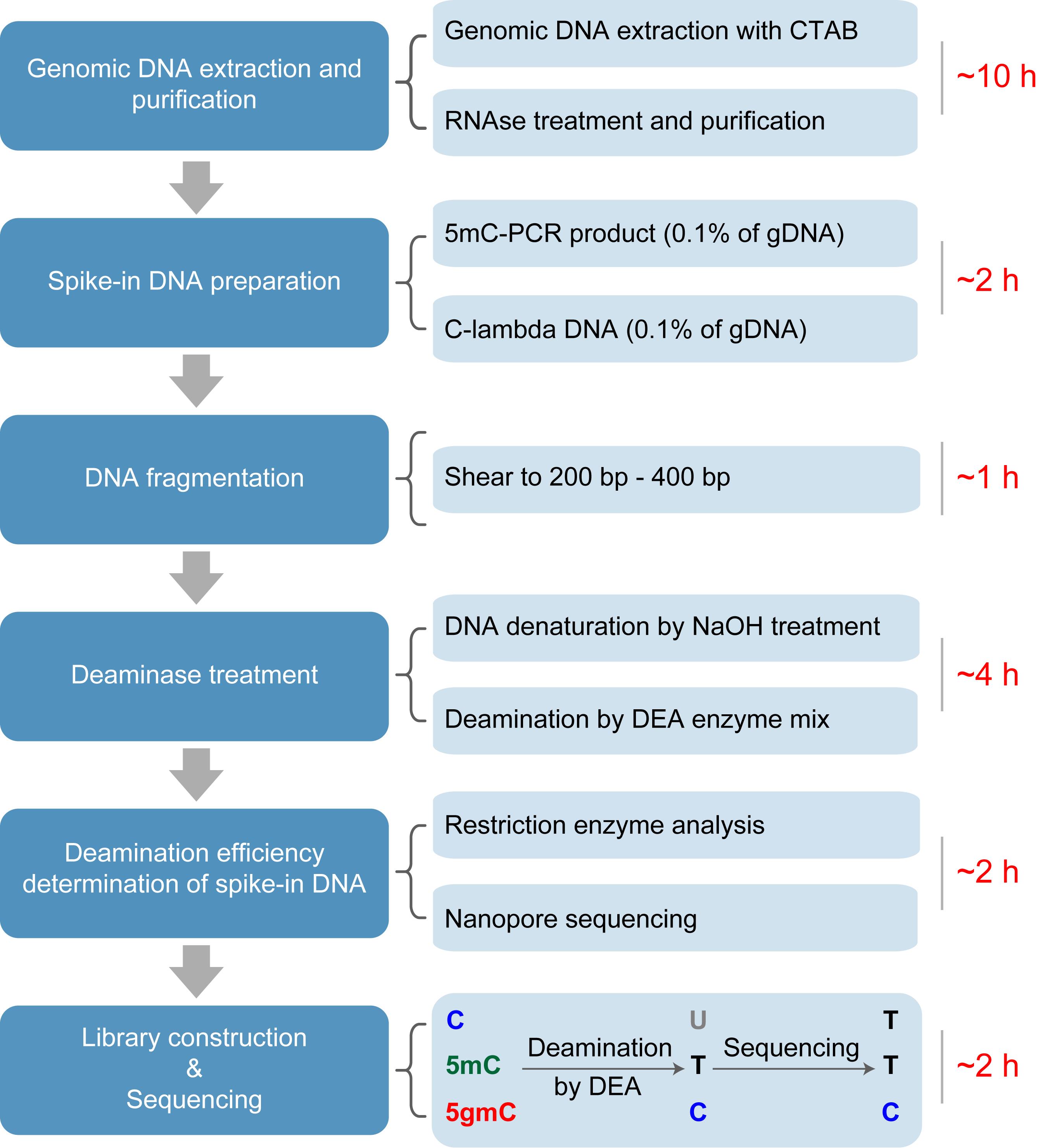 Note: All reagents should be stored according to the manufacturer’s instructions. The DEA enzyme mix is critical for this protocol because it exhibits specific deamination activity toward unmodified cytosine and 5mC, but not 5gmC. In contrast, other reagents may be substituted with suitable alternatives, provided that equivalent performance is validated.